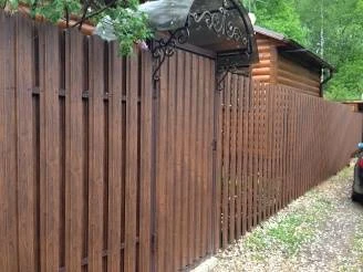 Фактурный евроштакетник появился на отечественном рынке сравнительно недавно. Несмотря на короткий период продаж, материал стал востребованным у собственников загородных домов и дачных участков. Изделия, имитирующие дерево, гармонично вписываются в окружающий ландшафт и сохраняют все высокие эксплуатационные характеристики металла. Дизайн забора из евроштакетника — металлические полосы шириной 10 - 12 см (длина выбирается в индивидуальном порядке). На лицевую сторону этого материала для увеличения декоративных свойств наносится покрытие под дерево.